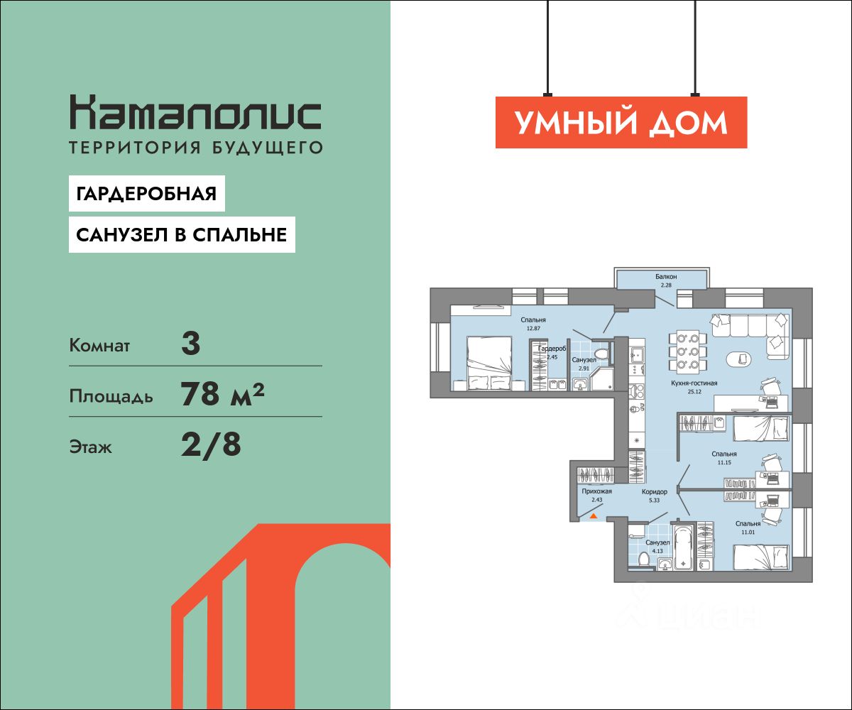 В новом жилом комплексе комфорт+ класса ''Камаполис'', расположенном на берегу реки Камы, продается 3-комнатная квартира площадью 78.00 кв. м. Квартира находится в 4 доме. Девелопер проекта - ''Железно''. Транспортная доступность • Трамвайная остановка всего в 3 минутах пешком, • 15 минут ходьбы до вокзала Пермь-2, • 10 минут на машине до центра города. Продуманный архитектурный проект Камаполис - это жизнь в соразмерной среде, спроектированной известными архитекторами. Жилые этажи ''Камаполиса'' строят из кирпича и по монолитной технологии, стены обладают высокой устойчивостью к нагрузкам, огнестойкостью, хорошей шумоизоляцией. Такие дома отлично сохраняют первоначальный внешний вид и радуют жителей долгие годы. Концептуальные лобби Концепция проекта продолжается интерьером лобби. Здесь преобладают естественные оттенки и текстуры, а мебель выполнена из экологичных материалов. Для удобства жителей созданы собственные колясочные и велосипедные, а для заботы о домашних любимцах предусмотрена лапомойка. Благоустройство Новый центр притяжения - всесезонный сквер, выполненный в тематике и стилистике пермского периода. Прогулочные зоны, игровые и спортивные площадки, релакс-зоны и места для творчества - все эти мультифункциональные пространства формируют сценарии для любого досуга. Любители особой приватности оценят соседские террасы - это специальные пространства для жителей, расположенные прямо на стилобате паркинга. Любуйтесь на реку, принимайте участие в совместных мероприятиях с соседями, с удовольствием работайте на свежем воздухе и приятно проводите время с близкими. Дополнительные преимущества • Собственный детский сад на 320 мест, • Стрит-ритейл с магазинами и кафе прямо на территории комплекса, • Управление домом через собственное мобильное приложение ''Мажордом'', • 3 разных вида отделки на выбор покупателей.