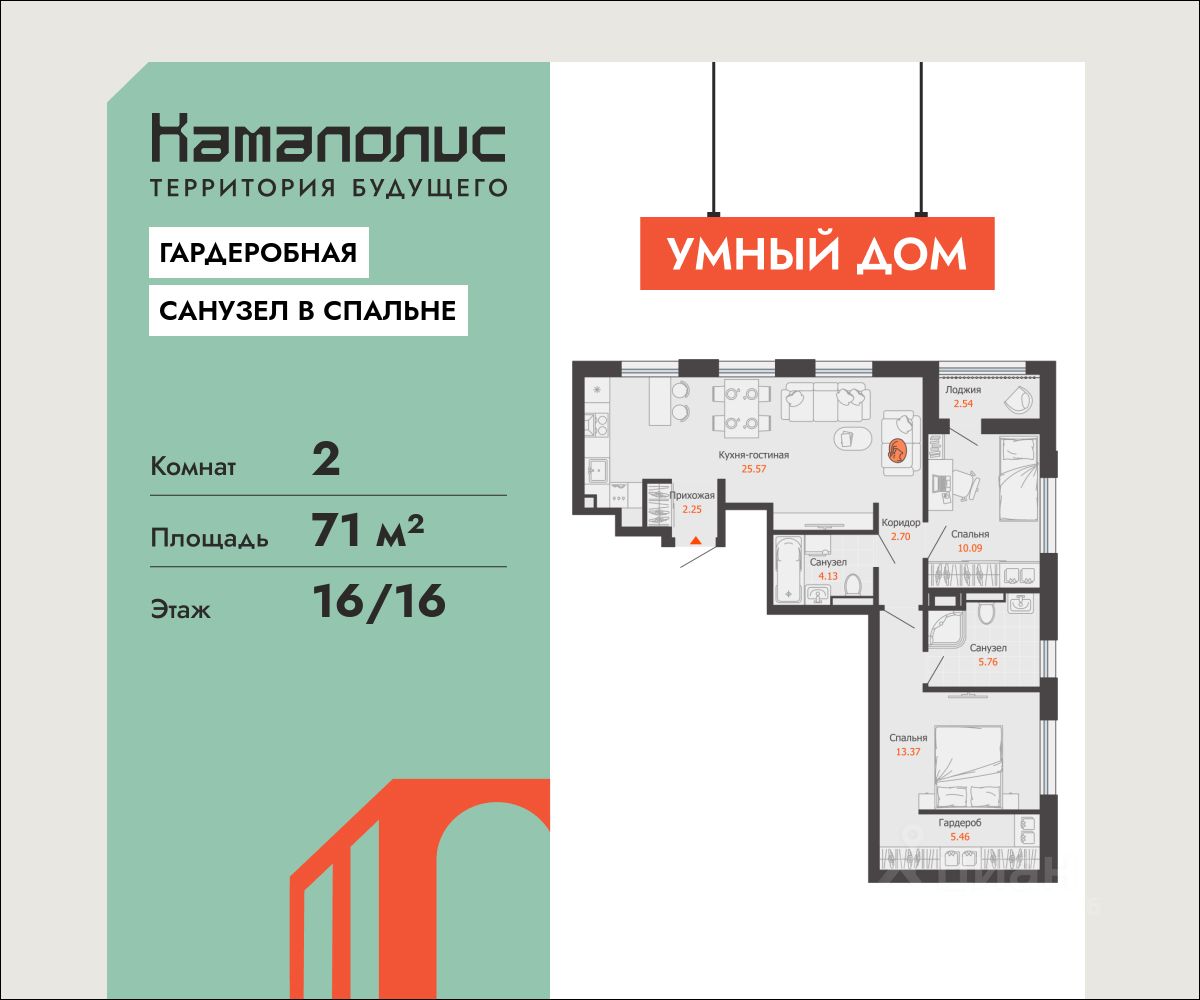 В новом жилом комплексе комфорт+ класса ''Камаполис'', расположенном на берегу реки Камы, продается 2-комнатная квартира площадью 71.00 кв. м. Квартира находится в 5 (1 этап) доме. Девелопер проекта - ''Железно''. Транспортная доступность • Трамвайная остановка всего в 3 минутах пешком, • 15 минут ходьбы до вокзала Пермь-2, • 10 минут на машине до центра города. Продуманный архитектурный проект Камаполис - это жизнь в соразмерной среде, спроектированной известными архитекторами. Жилые этажи ''Камаполиса'' строят из кирпича и по монолитной технологии, стены обладают высокой устойчивостью к нагрузкам, огнестойкостью, хорошей шумоизоляцией. Такие дома отлично сохраняют первоначальный внешний вид и радуют жителей долгие годы. Концептуальные лобби Концепция проекта продолжается интерьером лобби. Здесь преобладают естественные оттенки и текстуры, а мебель выполнена из экологичных материалов. Для удобства жителей созданы собственные колясочные и велосипедные, а для заботы о домашних любимцах предусмотрена лапомойка. Благоустройство Новый центр притяжения - всесезонный сквер, выполненный в тематике и стилистике пермского периода. Прогулочные зоны, игровые и спортивные площадки, релакс-зоны и места для творчества - все эти мультифункциональные пространства формируют сценарии для любого досуга. Любители особой приватности оценят соседские террасы - это специальные пространства для жителей, расположенные прямо на стилобате паркинга. Любуйтесь на реку, принимайте участие в совместных мероприятиях с соседями, с удовольствием работайте на свежем воздухе и приятно проводите время с близкими. Дополнительные преимущества • Собственный детский сад на 320 мест, • Стрит-ритейл с магазинами и кафе прямо на территории комплекса, • Управление домом через собственное мобильное приложение ''Мажордом'', • 3 разных вида отделки на выбор покупателей.