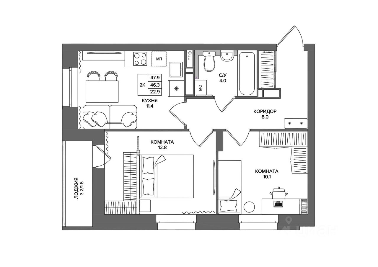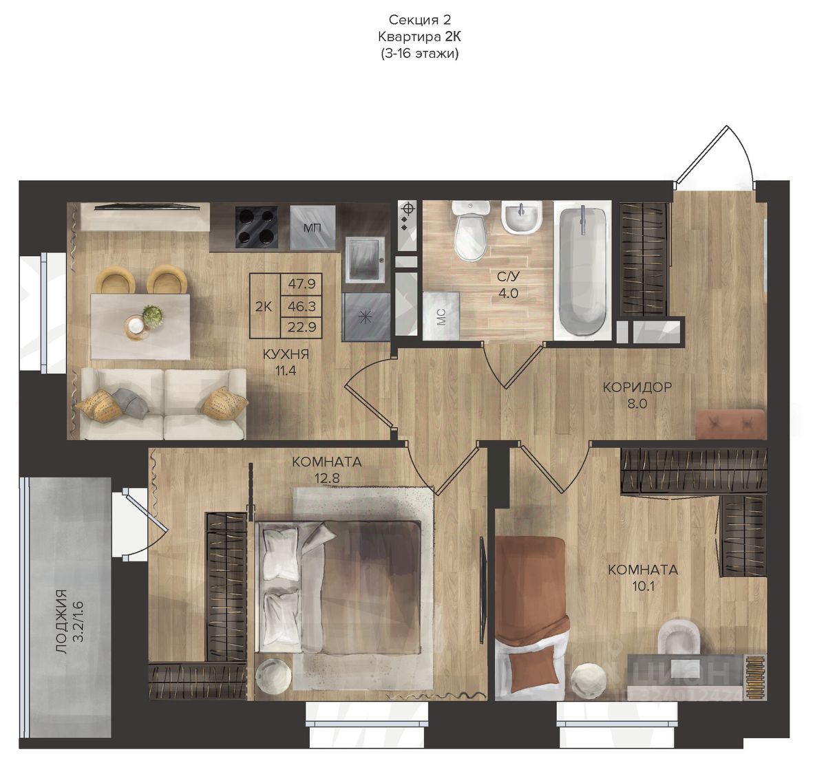 47 м² · Этаж 14 из 16