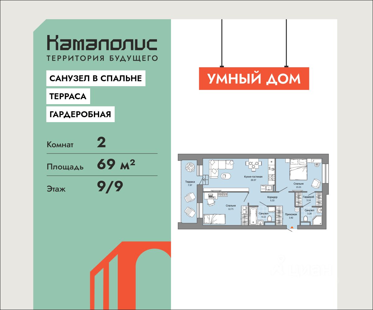 Особенность планировки - собственная терраса, ощутите преимущества загородного отдыха и полного единения с окружающей Вас красотой с видом на гладь воды Камы. В новом жилом комплексе комфорт+ класса ''Камаполис'', расположенном на берегу реки Камы, продается 2-комнатная квартира площадью 69.00 кв. м. Квартира находится в 4 доме. Девелопер проекта - ''Железно''. Транспортная доступность • Трамвайная остановка всего в 3 минутах пешком, • 15 минут ходьбы до вокзала Пермь-2, • 10 минут на машине до центра города. Продуманный архитектурный проект Камаполис - это жизнь в соразмерной среде, спроектированной известными архитекторами. Жилые этажи ''Камаполиса'' строят из кирпича и по монолитной технологии, стены обладают высокой устойчивостью к нагрузкам, огнестойкостью, хорошей шумоизоляцией. Такие дома отлично сохраняют первоначальный внешний вид и радуют жителей долгие годы. Концептуальные лобби Концепция проекта продолжается интерьером лобби. Здесь преобладают естественные оттенки и текстуры, а мебель выполнена из экологичных материалов. Для удобства жителей созданы собственные колясочные и велосипедные, а для заботы о домашних любимцах предусмотрена лапомойка. Благоустройство Новый центр притяжения - всесезонный сквер, выполненный в тематике и стилистике пермского периода. Прогулочные зоны, игровые и спортивные площадки, релакс-зоны и места для творчества - все эти мультифункциональные пространства формируют сценарии для любого досуга. Любители особой приватности оценят соседские террасы - это специальные пространства для жителей, расположенные прямо на стилобате паркинга. Любуйтесь на реку, принимайте участие в совместных мероприятиях с соседями, с удовольствием работайте на свежем воздухе и приятно проводите время с близкими. Дополнительные преимущества • Собственный детский сад на 320 мест, • Стрит-ритейл с магазинами и кафе прямо на территории комплекса, • Управление домом через собственное мобильное приложение ''Мажордом'', • 3 разных вида отделки на выбор покупателей.