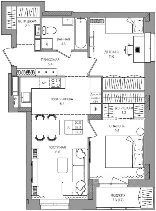 60 м² · Этаж 7 из 16