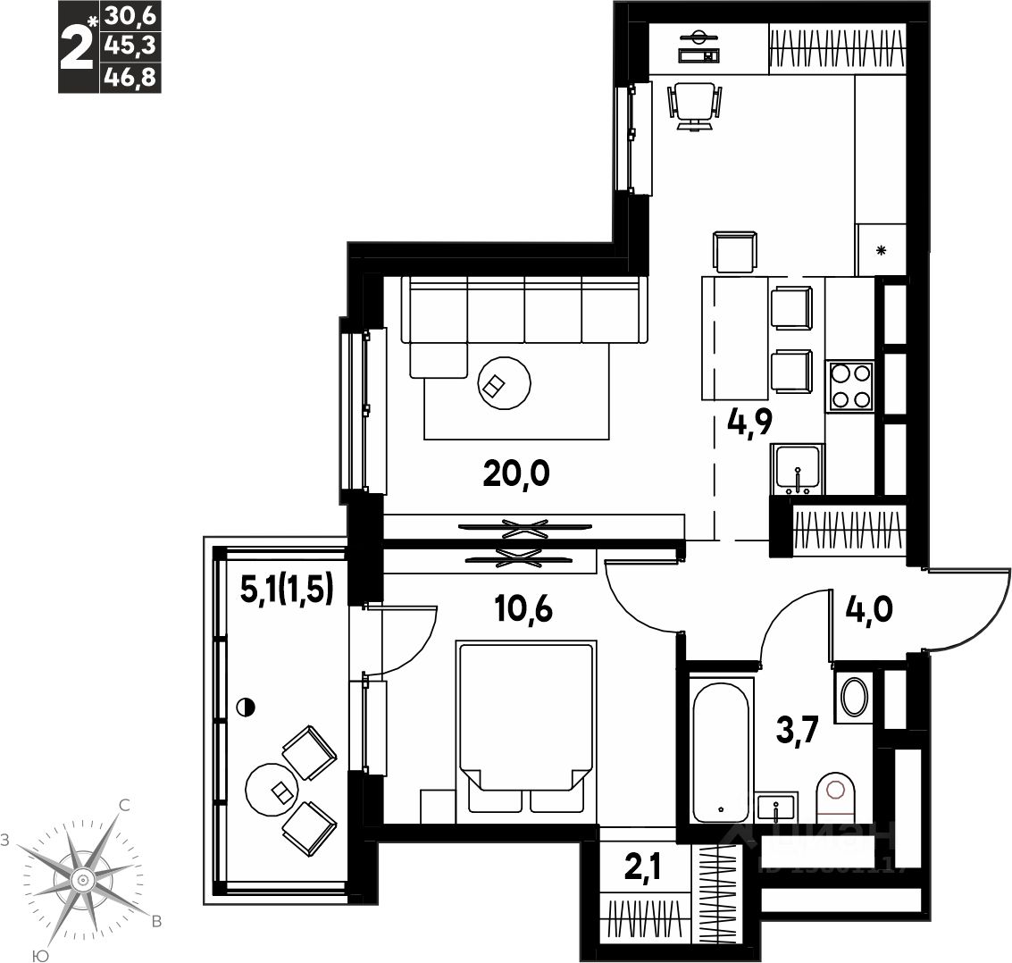 46 м² · Этаж 9 из 16