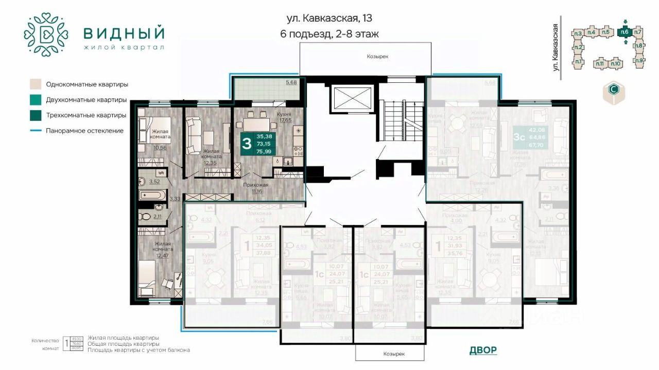 Продаётся 3-комнатная квартира в строящемся доме (корпус 2 (Кавказская, 13к2)), срок сдачи: II-кв. 2028, общей площадью 75.99 кв.м., на 6 этаже. Новый жилой комплекс ''Жилой квартал ''Видный'' от Специализированного застройщика ''СПК-Кавказская'' расположен по адресу: г. Пермь, ул. Кавказская, 13.