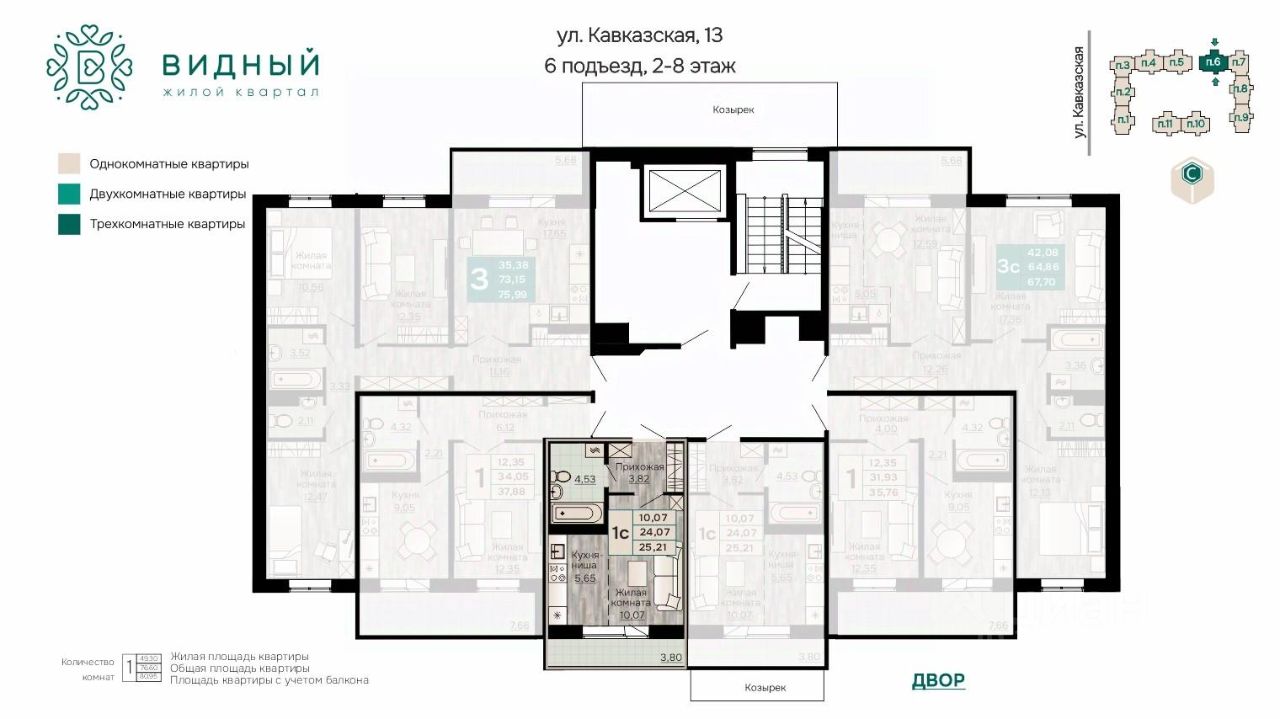 Продаётся 1-комнатная квартира в строящемся доме (корпус 2 (Кавказская, 13к2)), срок сдачи: II-кв. 2028, общей площадью 25.21 кв.м., на 6 этаже. Новый жилой комплекс ''Жилой квартал ''Видный'' от Специализированного застройщика ''СПК-Кавказская'' расположен по адресу: г. Пермь, ул. Кавказская, 13.