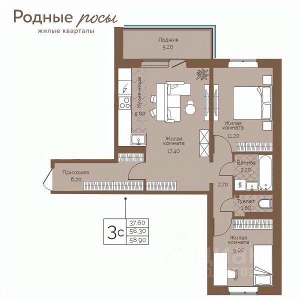 Продаётся 3-комнатная квартира в строящемся доме (Академическая, 9), срок сдачи: III-кв. 2027, общей площадью 58.9 кв.м., на 7 этаже. Новый жилой комплекс ''Родные росы'' от Специализированного застройщика ''Финпроект'' расположен в с. Фролы по ул. Академическая.