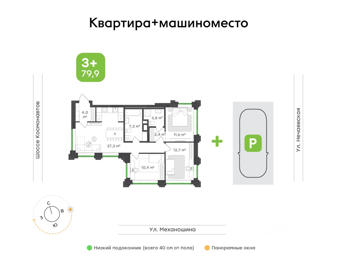 Семейное пространство, где комфорт продуман до деталей. Кухня-гостиная 27 м² — сердце дома для встреч, ужинов и отдыха всей семьёй, Окна выходят на четыре стороны — больше света, воздуха и ощущение открытого пространства, Мастер-спальня — приватная зона для восстановления и тишины, Просторная ванная комната 7м² — больше места для утреннего спокойствия, Удобная ниша под кухонный гарнитур — гармоничное зонирование без перегрузки пространства, В прихожей предусмотрена ниша под шкаф-купе — организованность с первого шага, Окна с низким подоконником (всего 40 см от пола) наполняют квартиру светом и делают вид частью интерьера, Потолки 2,7 м — воздух, объём и эстетика архитектуры.