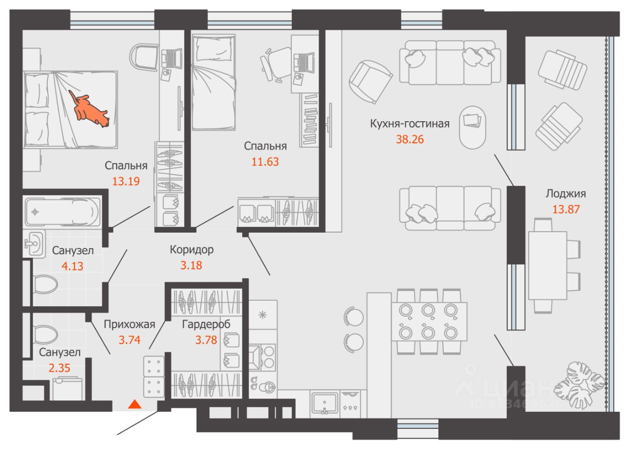 58 м² · Этаж 13 из 16