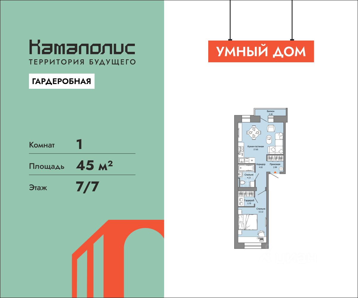 В новом жилом комплексе комфорт+ класса ''Камаполис'', расположенном на берегу реки Камы, продается 1-комнатная квартира площадью 45.00 кв. м. Квартира находится в 4 доме. Девелопер проекта - ''Железно''. Транспортная доступность • Трамвайная остановка всего в 3 минутах пешком, • 15 минут ходьбы до вокзала Пермь-2, • 10 минут на машине до центра города. Продуманный архитектурный проект Камаполис - это жизнь в соразмерной среде, спроектированной известными архитекторами. Жилые этажи ''Камаполиса'' строят из кирпича и по монолитной технологии, стены обладают высокой устойчивостью к нагрузкам, огнестойкостью, хорошей шумоизоляцией. Такие дома отлично сохраняют первоначальный внешний вид и радуют жителей долгие годы. Концептуальные лобби Концепция проекта продолжается интерьером лобби. Здесь преобладают естественные оттенки и текстуры, а мебель выполнена из экологичных материалов. Для удобства жителей созданы собственные колясочные и велосипедные, а для заботы о домашних любимцах предусмотрена лапомойка. Благоустройство Новый центр притяжения - всесезонный сквер, выполненный в тематике и стилистике пермского периода. Прогулочные зоны, игровые и спортивные площадки, релакс-зоны и места для творчества - все эти мультифункциональные пространства формируют сценарии для любого досуга. Любители особой приватности оценят соседские террасы - это специальные пространства для жителей, расположенные прямо на стилобате паркинга. Любуйтесь на реку, принимайте участие в совместных мероприятиях с соседями, с удовольствием работайте на свежем воздухе и приятно проводите время с близкими. Дополнительные преимущества • Собственный детский сад на 320 мест, • Стрит-ритейл с магазинами и кафе прямо на территории комплекса, • Управление домом через собственное мобильное приложение ''Мажордом'', • 3 разных вида отделки на выбор покупателей.