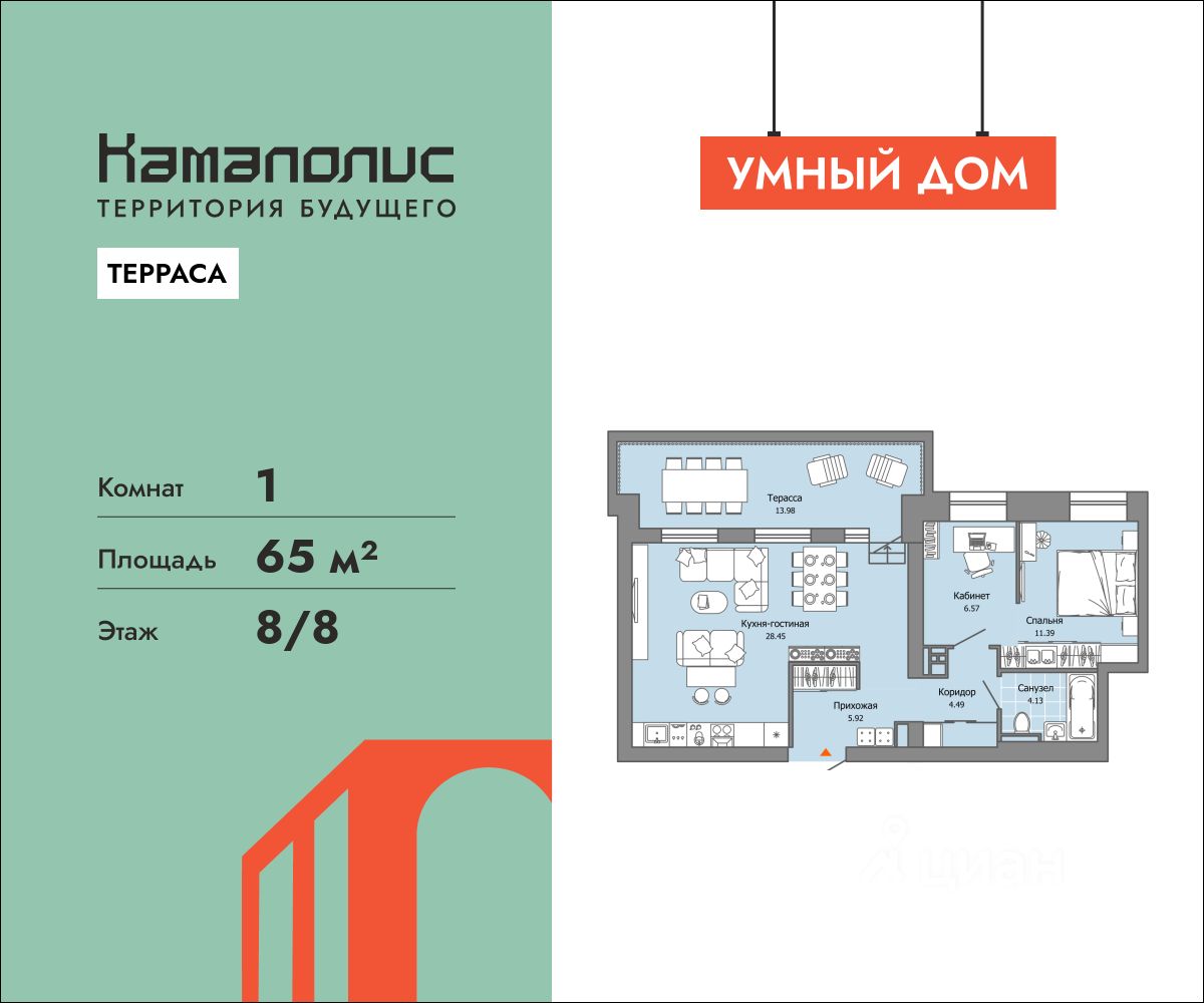 Особенность планировки - собственная терраса, ощутите преимущества загородного отдыха и полного единения с окружающей Вас красотой с видом на гладь воды Камы. В новом жилом комплексе комфорт+ класса ''Камаполис'', расположенном на берегу реки Камы, продается 1-комнатная квартира площадью 65.00 кв. м. Квартира находится в 4 доме. Девелопер проекта - ''Железно''. Транспортная доступность • Трамвайная остановка всего в 3 минутах пешком, • 15 минут ходьбы до вокзала Пермь-2, • 10 минут на машине до центра города. Продуманный архитектурный проект Камаполис - это жизнь в соразмерной среде, спроектированной известными архитекторами. Жилые этажи ''Камаполиса'' строят из кирпича и по монолитной технологии, стены обладают высокой устойчивостью к нагрузкам, огнестойкостью, хорошей шумоизоляцией. Такие дома отлично сохраняют первоначальный внешний вид и радуют жителей долгие годы. Концептуальные лобби Концепция проекта продолжается интерьером лобби. Здесь преобладают естественные оттенки и текстуры, а мебель выполнена из экологичных материалов. Для удобства жителей созданы собственные колясочные и велосипедные, а для заботы о домашних любимцах предусмотрена лапомойка. Благоустройство Новый центр притяжения - всесезонный сквер, выполненный в тематике и стилистике пермского периода. Прогулочные зоны, игровые и спортивные площадки, релакс-зоны и места для творчества - все эти мультифункциональные пространства формируют сценарии для любого досуга. Любители особой приватности оценят соседские террасы - это специальные пространства для жителей, расположенные прямо на стилобате паркинга. Любуйтесь на реку, принимайте участие в совместных мероприятиях с соседями, с удовольствием работайте на свежем воздухе и приятно проводите время с близкими. Дополнительные преимущества • Собственный детский сад на 320 мест, • Стрит-ритейл с магазинами и кафе прямо на территории комплекса, • Управление домом через собственное мобильное приложение ''Мажордом'', • 3 разных вида отделки на выбор покупателей.