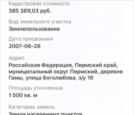 Продам земельный участок 15 соток в д. Гамы Пермского района. Категория земель: Земли населенных пунктов, разрешенное использование: Для ведения личного подсобного хозяйства.Участок сухой, ровный, имеется добротный фундамент 1012 метров. Подъезд к участку круглогодичный, асфальтированный, дороги зимой чистят. Все коммуникации рядом, деревня газифицирована. В шаговой доступности находятся продуктовый магазин, Озон, фельдшерско-акушерский пункт, хоккейная коробка с площадкой воркаут и река Кама с заливами.Звоните, покажу участок в удобное для вас время.Кадастровый номер: 59:32:3070002:363