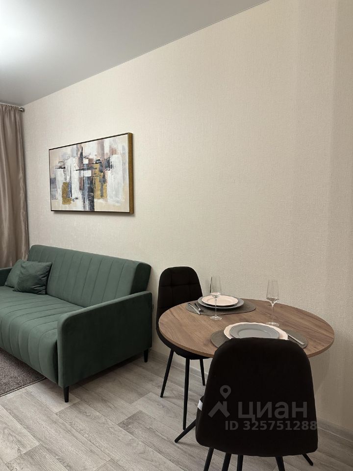 Сдается уютная квартира-студия в ЖК Погода. В квартире есть все для комфортного проживания: холодильник, микроволновая печь, чайник, плита, посуда, столовые приборы, телевизор, стиральная машина, пылесос, 2 больших шкафа для хранения вещей, большой и удобный диван, кухонный гарнитур, обеденный стол со стульями, полка-стеллаж, которая визуально делит комнату на две части. При желании в зоне кухни можно поставить еще диван, что создаст еще одно дополнительное место. Окна выходят на солнечную сторону, прекрасный вид на поле и лес.