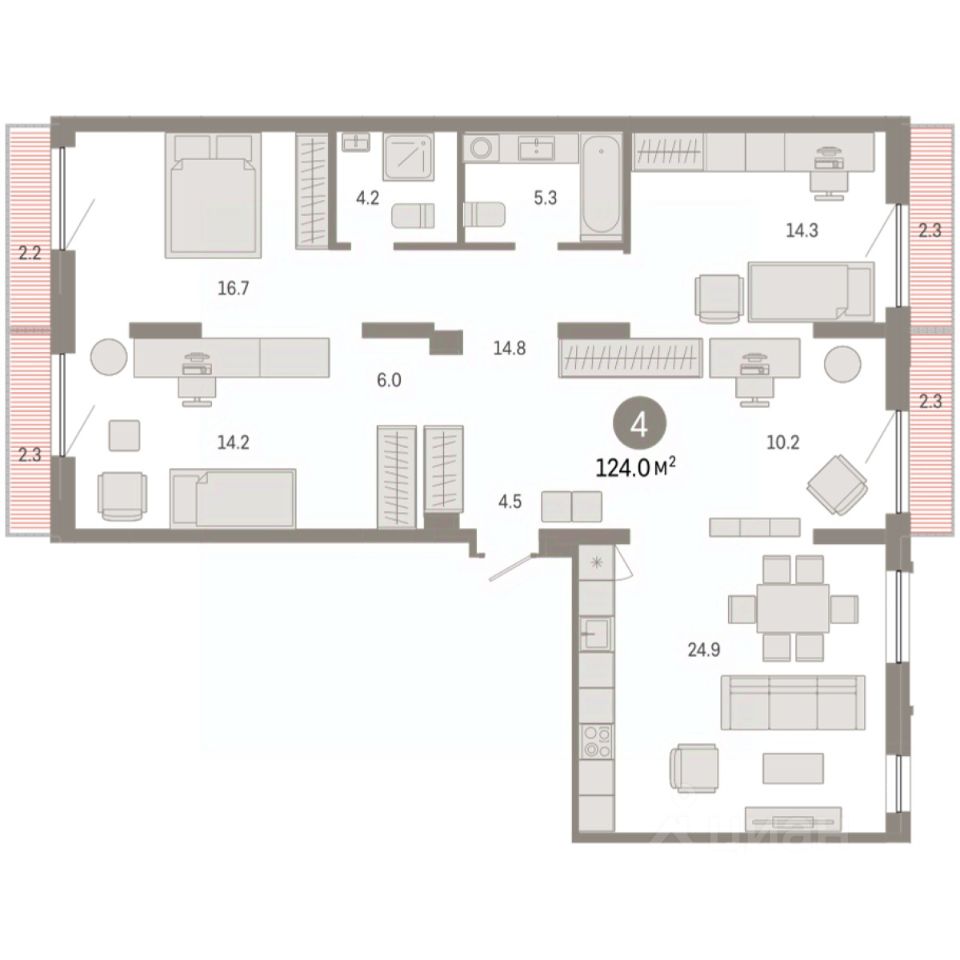 Квартира с кухней-гостиной и четырьмя спальнями в Октябрьском на Туре. Особенности планировки: балкон, рабочий кабинет, разнесённые спальни, свободная планировка. квартиры в нашей базе: ОКТ-10-1-1.2.5.