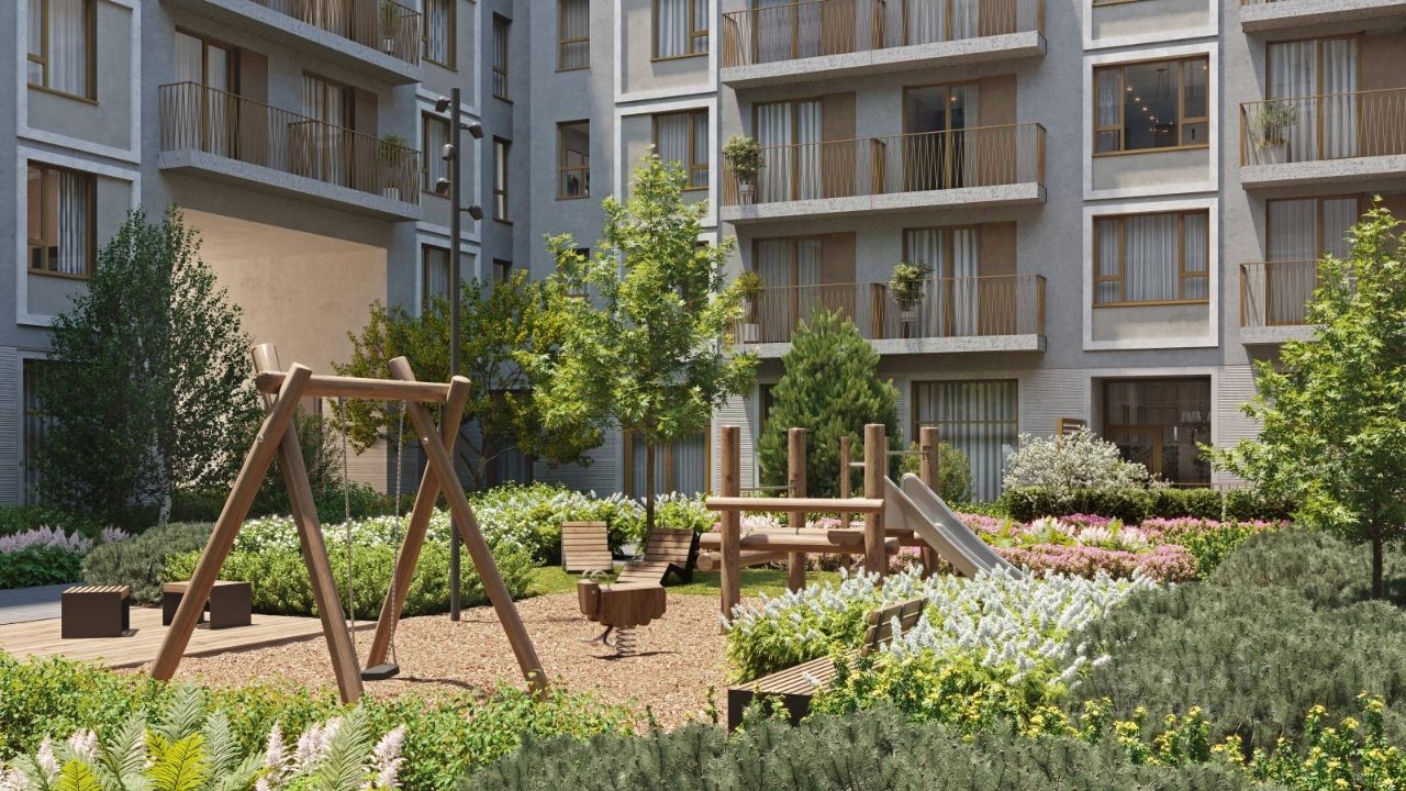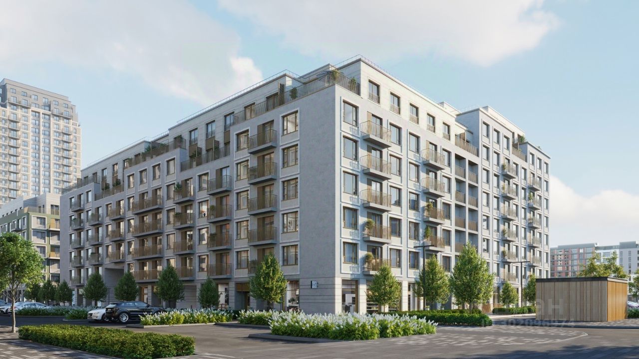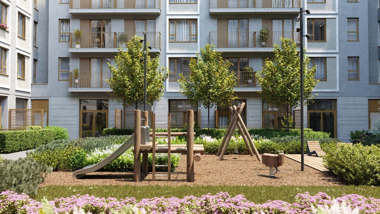 Смысловая ось квартала — широкая главная улица с высаженными вдоль неё высокими деревьями. Они создают тень и работают как шумо- и пылезащитные экраны. Это место сосредоточения основных пешеходных и транспортных потоков, на сторону которых мы ориентировали большинство коммерческих помещений. Отсюда жители могут свернуть на тихие соседские улицы и попасть на внутриквартальную площадь — ещё одну точку притяжения. #ZwIbw7