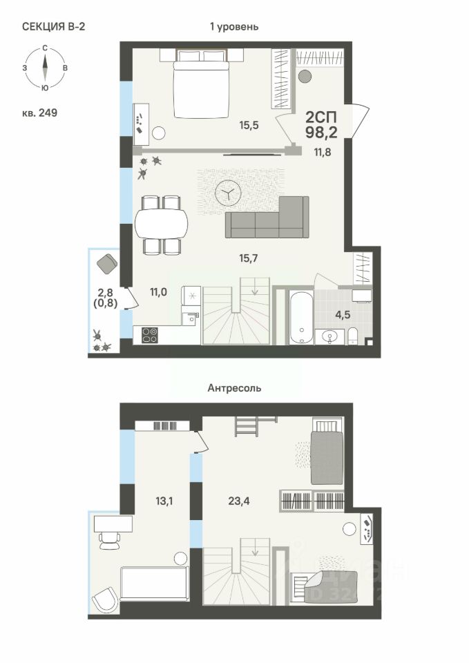 На первом уровне расположена просторная зона для жизни и приёма гостей. Второй уровень — это приватное пространство, которое можно использовать как кабинет, спальню, мастерскую или даже оборудовать полноценную ванную комнату. Все необходимые коммуникации уже выведены — максимум функциональности и свободы для ваших идей.