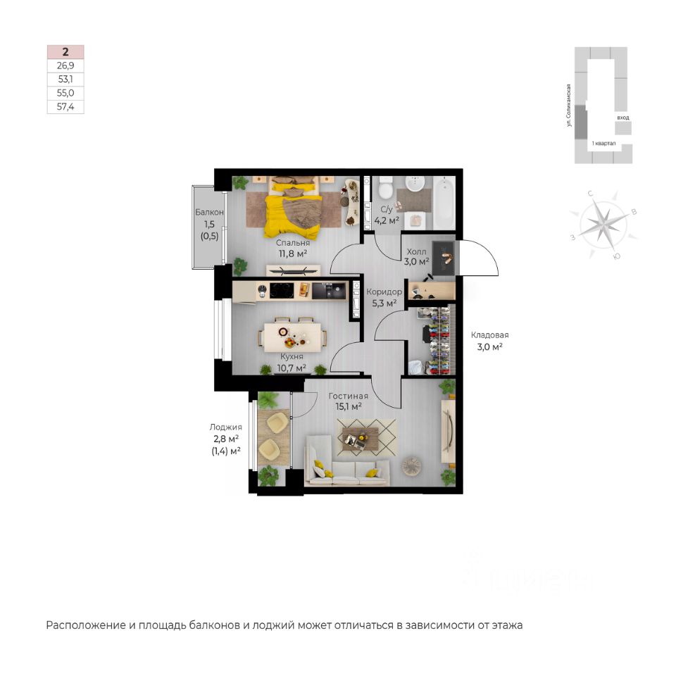 Продаётся 2-комнатная квартира в строящемся доме (I этап), срок сдачи: IV-кв. 2026, общей площадью 57.4 кв.м., на 6 этаже. Новый жилой комплекс ''Ветлан'' от застройщика ''Пермит'' расположен в г. Пермь на ул. Ивана Франко.