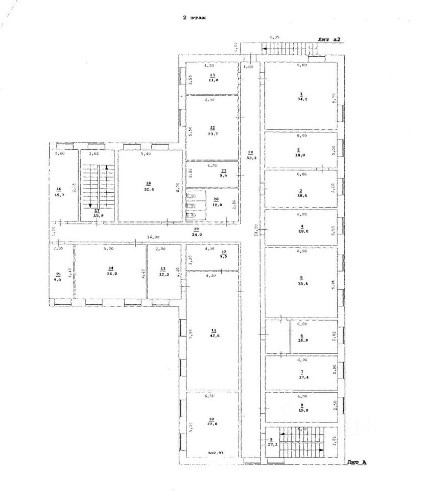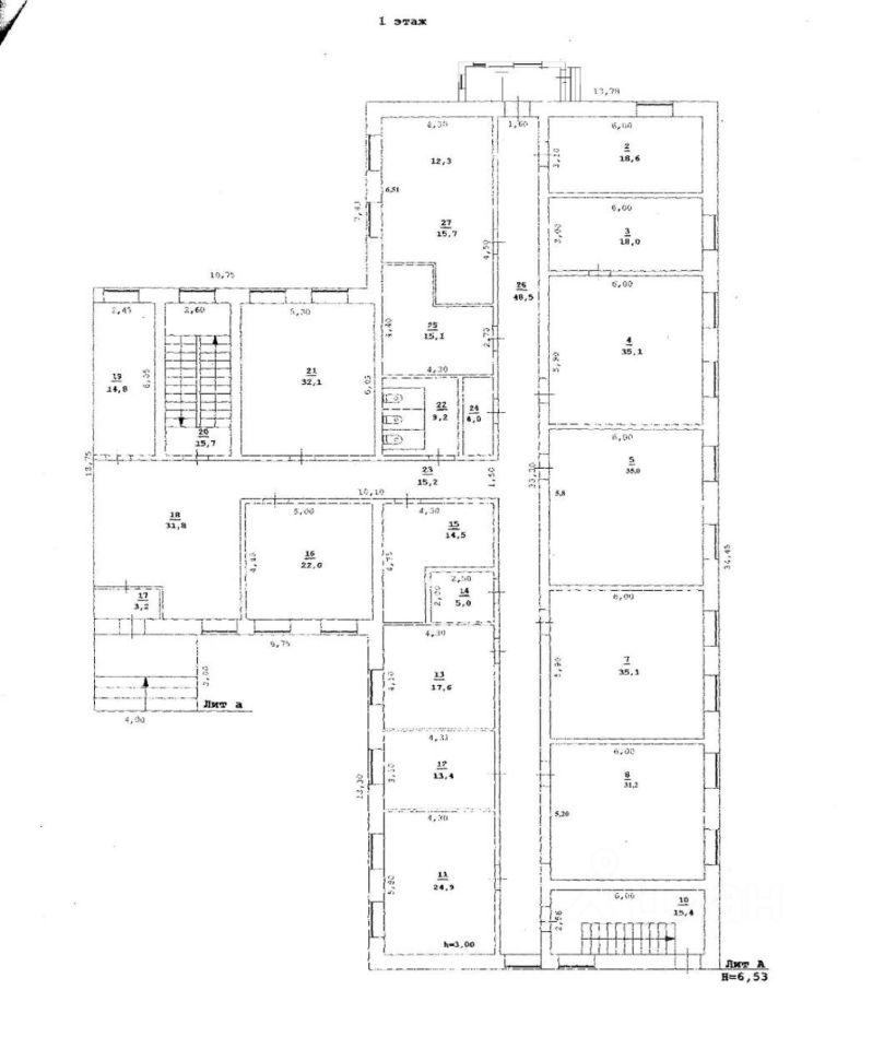 Всего в здании 33 кабинета различной площади (9 кв.м.- 42,6 кв. м.), санузлы на каждом этаже, серверная, подсобные помещения, кладовая, кабинеты с водоснабжением.