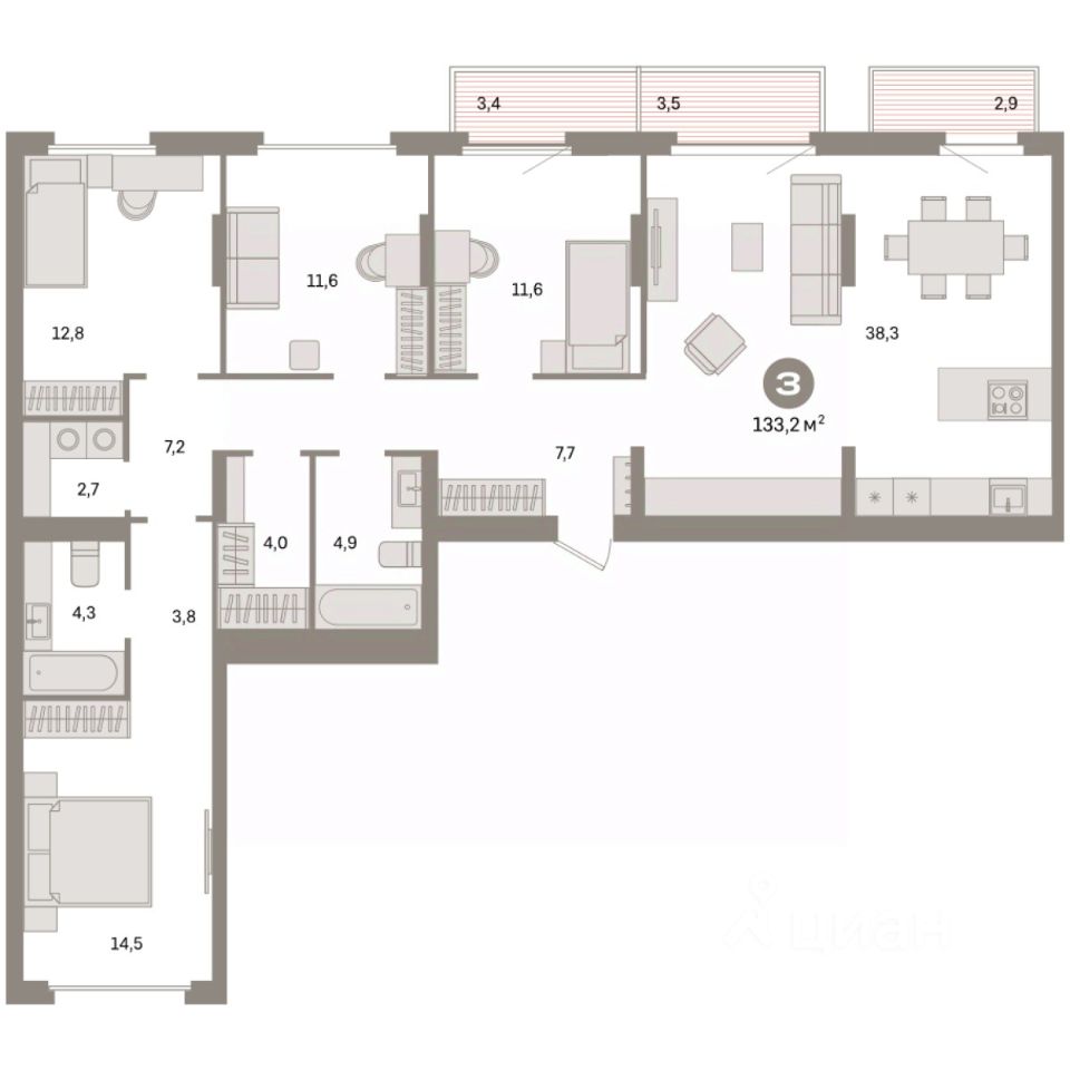 Квартира с кухней-гостиной и четырьмя спальнями в квартале ''Депо''. Особенности планировки: балкон, окна на две стороны, предчистовая отделка, рабочий кабинет, разнесённые спальни. квартиры в нашей базе: ДЕП04-Ж2.2.2.