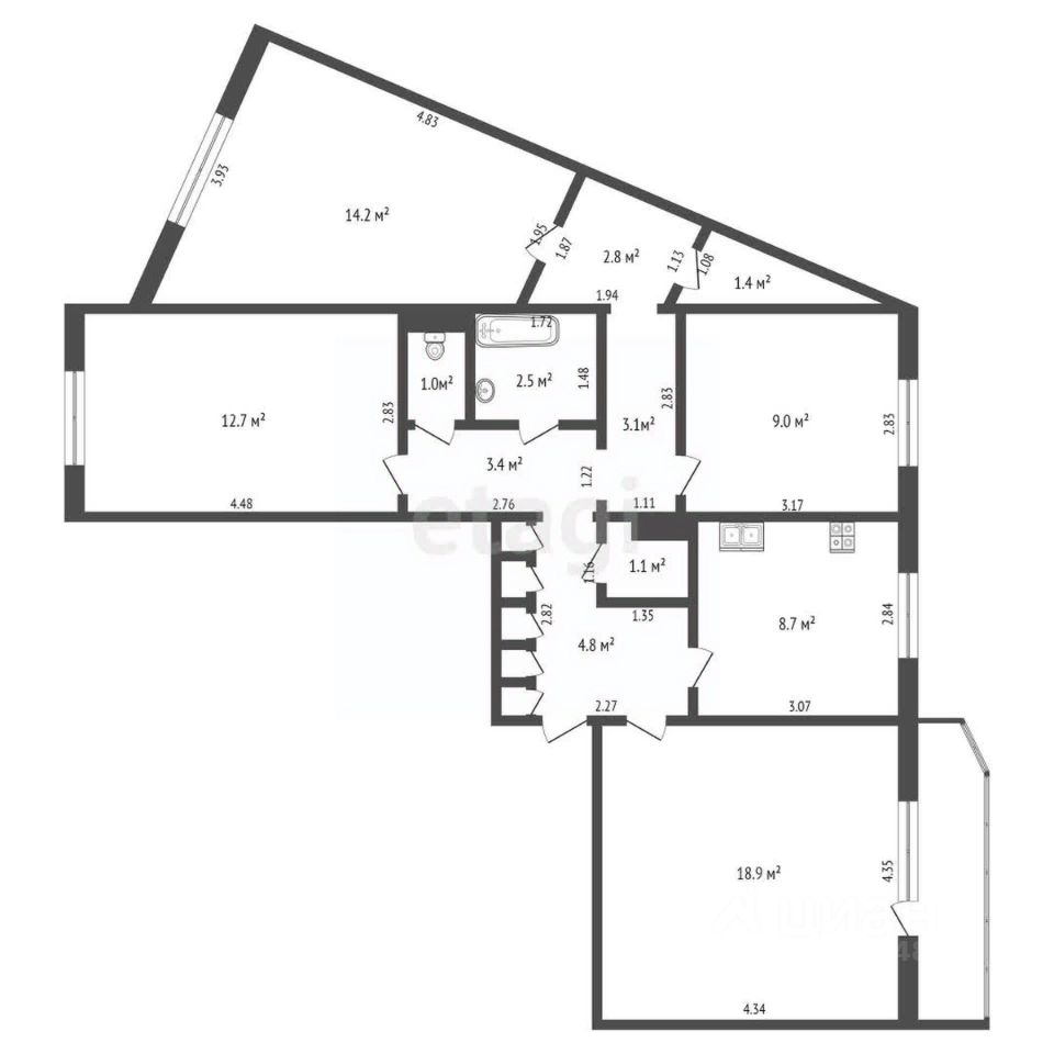 Большая квадратная кухня -8.7м , гостиная -18.9м, просторная прихожая, кладовая , изолированные спальни , гардеробная .