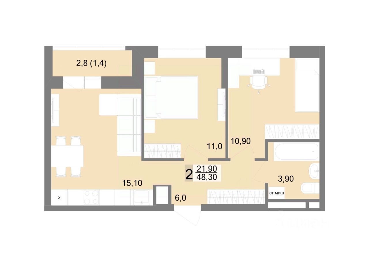 Общая площадь48,3 м2