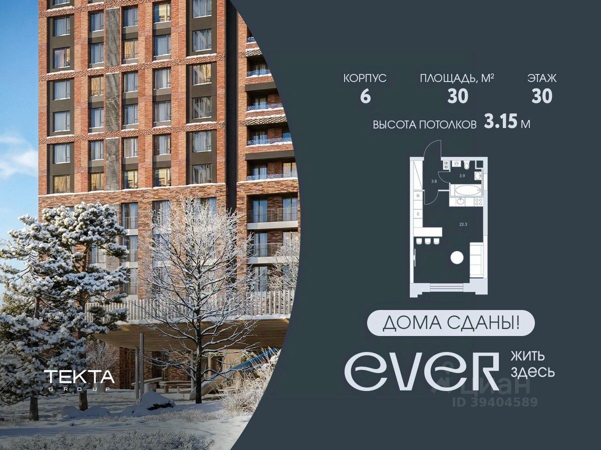 1-комн. квартира в ЖК ''Ever'' на 30 этаже в 34 этажном здании Корпус 6. Общая площадь: 30 кв.м., жилая: 15.1 кв.м. Высота потолков 3.15 м.