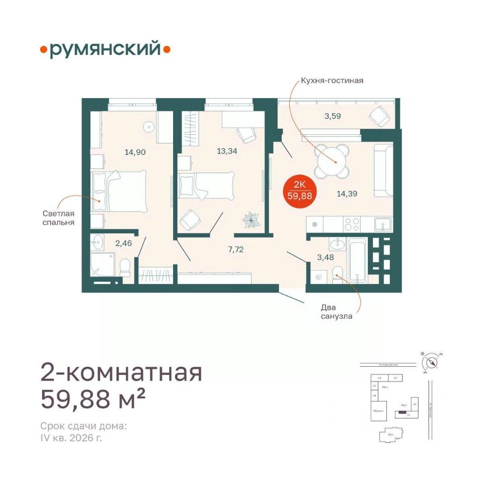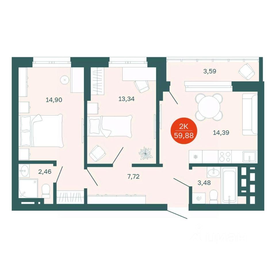 Общая площадь59,88 м2
