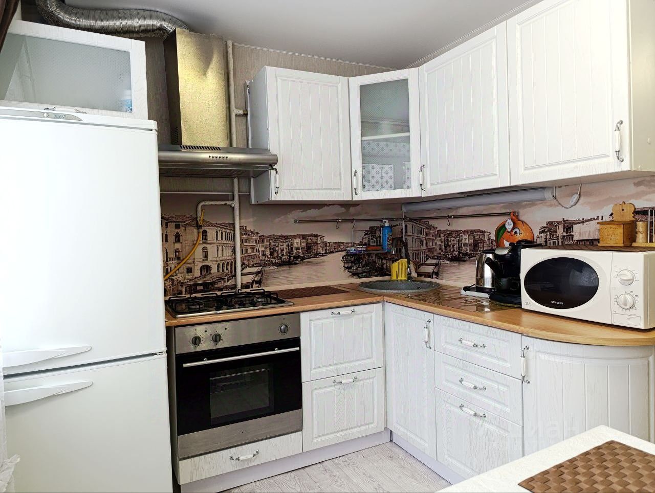 Двухкамерный холодильник Indesit Газовая варочная поверхность и встроенный электрический духовой шкаф Микроволновая печь Samsung Стиральная машина Indesit Кофемашина Delonghi Вертикальный пылесос Polaris Электрочайник, утюг