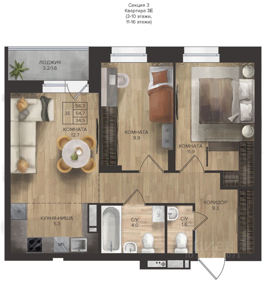 Общая площадь56,3 м2