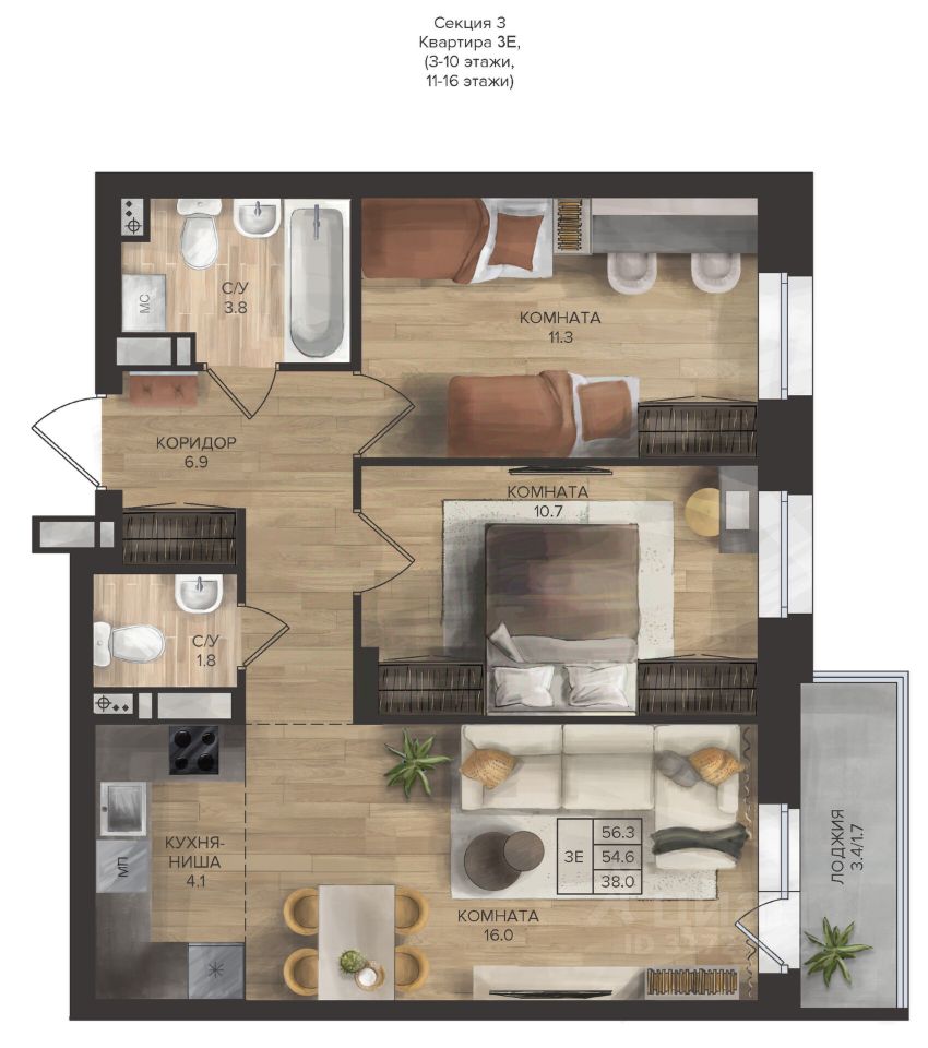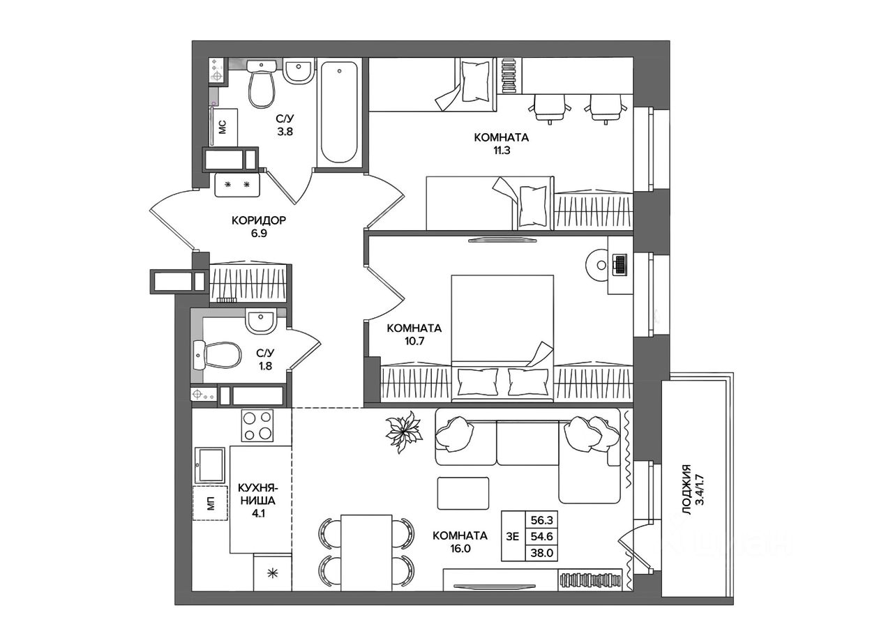 Общая площадь56,3 м2
