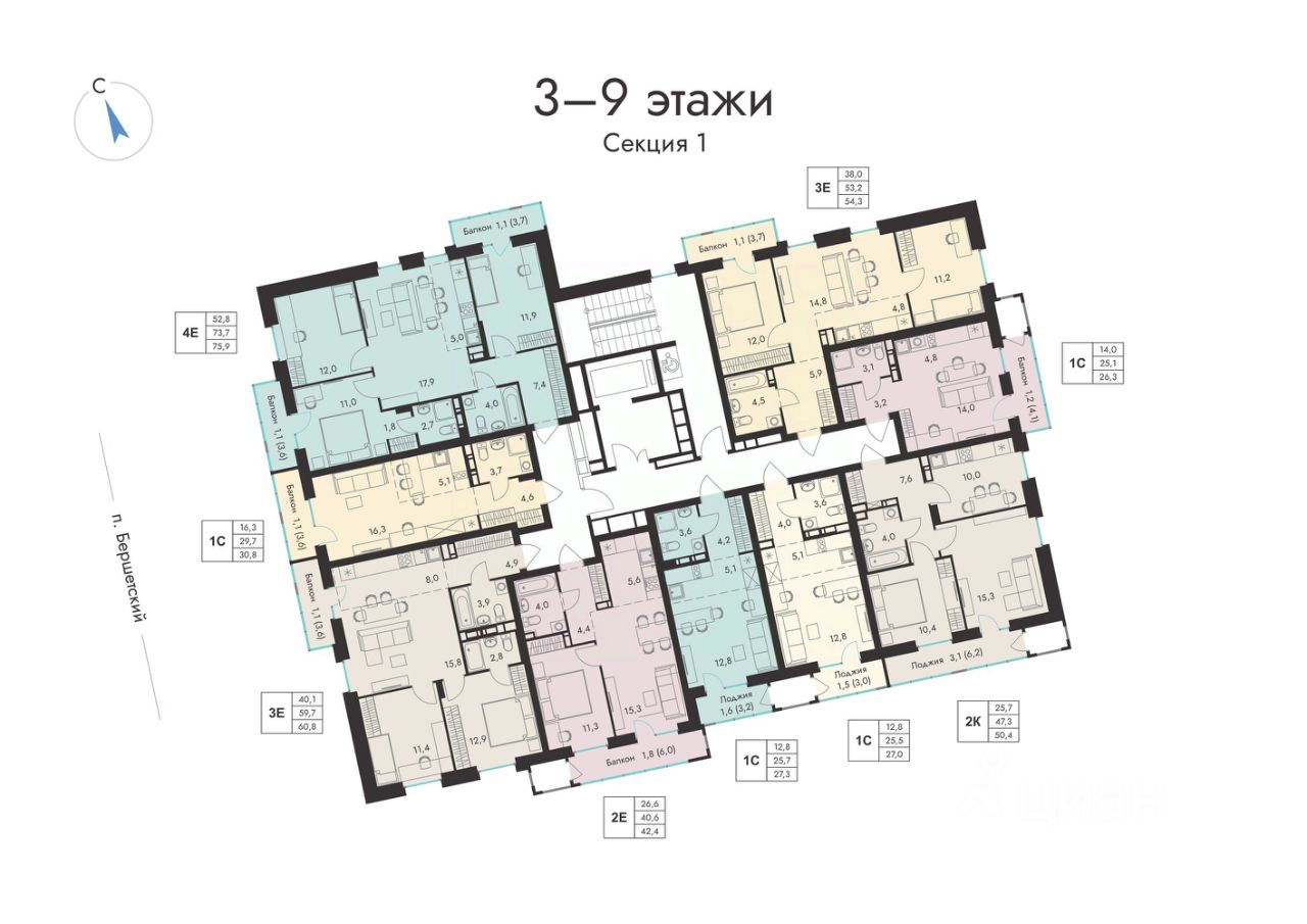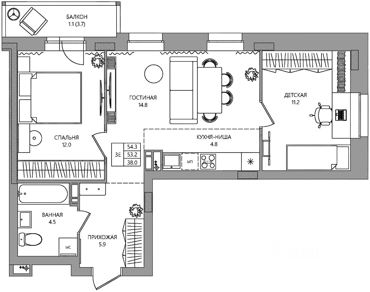 Общая площадь54,3 м2