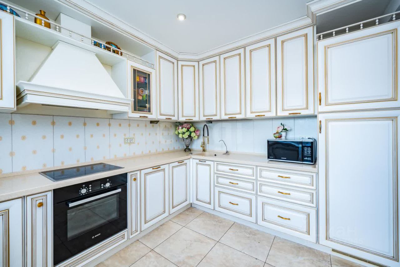 Кухня - исполнена в лучших традициях итальянского мастерства: Элегантный гарнитур ручной работы из солнечной Италии. - Столешница из натурального камня с золотыми прожилками. Встроенная техника премиум-класса.