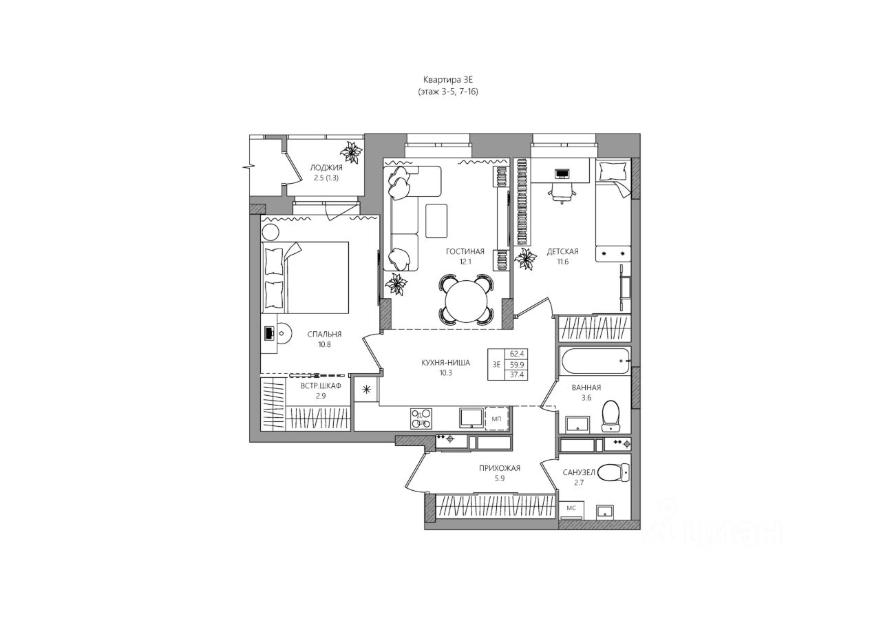 Жилая площадь37,4 м2