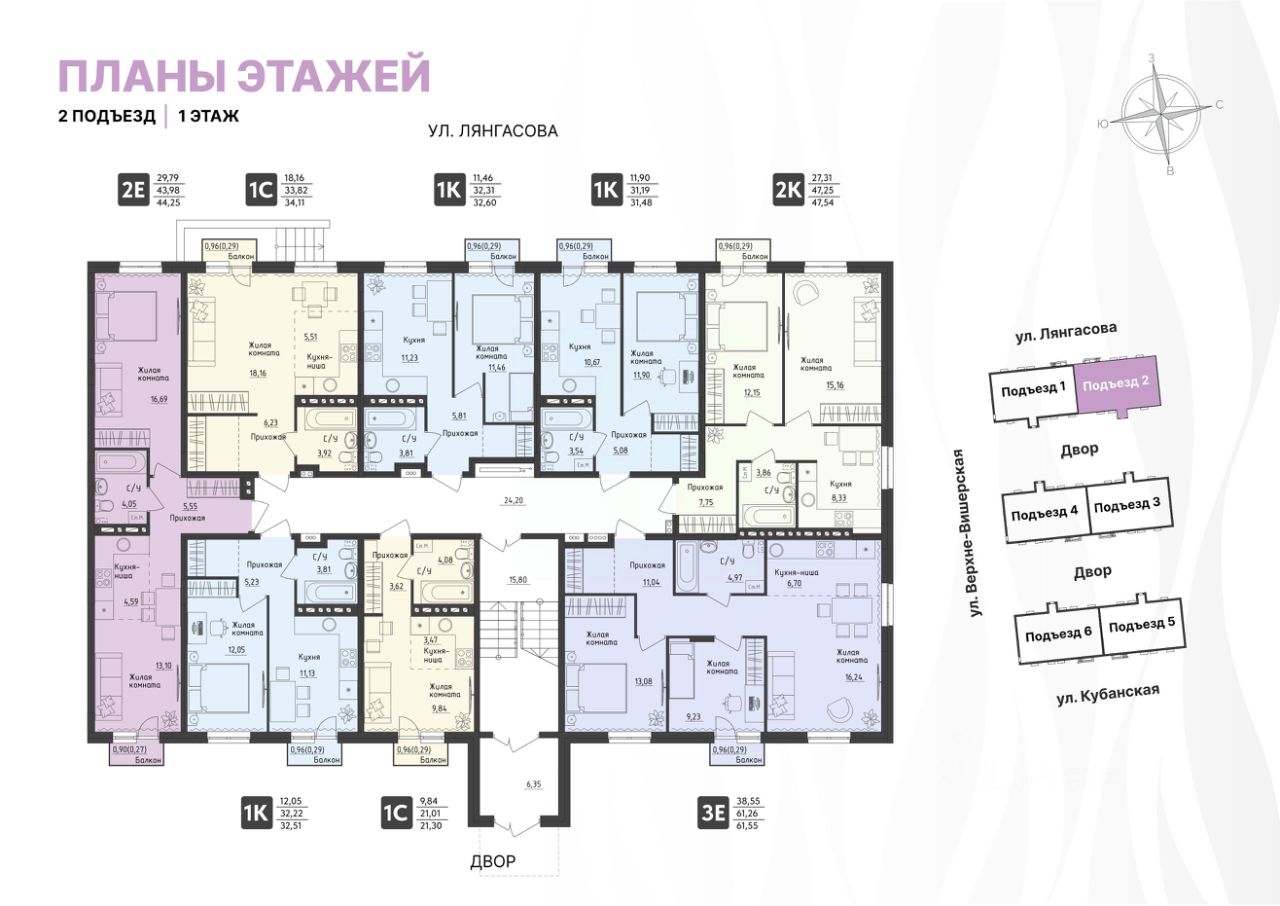 Стильные подъезды выполнены по индивидуальному дизайну. Предусмотрено место для хранения колясок, в 4 подъезде - колясочная. Подъезды оборудованы домофонами, расположенными в тёплых тамбурах. Витражное остекление входной группы позволяет увидеть то, что происходит во дворе.