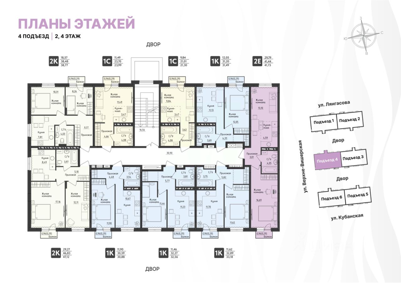 Стильные подъезды выполнены по индивидуальному дизайну. Предусмотрено место для хранения колясок, в 4 подъезде - колясочная. Подъезды оборудованы домофонами, расположенными в тёплых тамбурах. Витражное остекление входной группы позволяет увидеть то, что происходит во дворе.