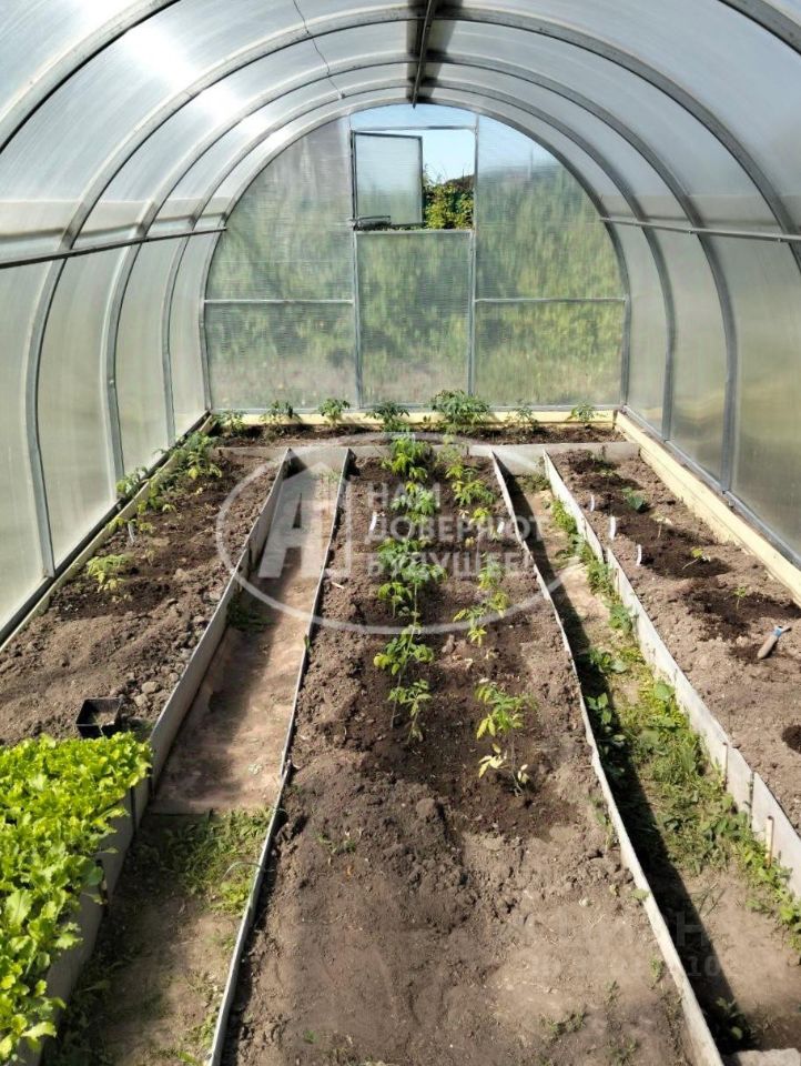На участке располагаются две теплицы, клумбы с цветами, различные кустарники и плодовые деревья.