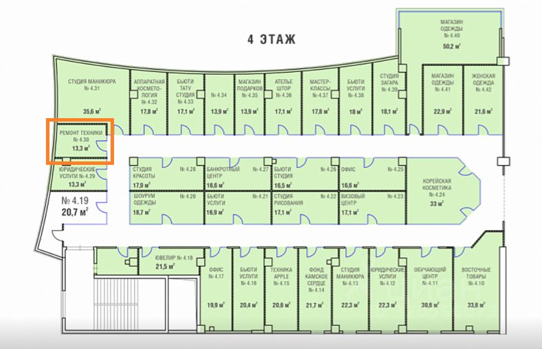 Сдам торгово-офисное помещение в ТЦ ''7 Пятниц''. Помещение 4.30 на плане, одно из лучших в крыле услуг, вид из помещения на этаж, а не в другое помещение напротив. 13.3 м. В цену всё включено. От собственника.