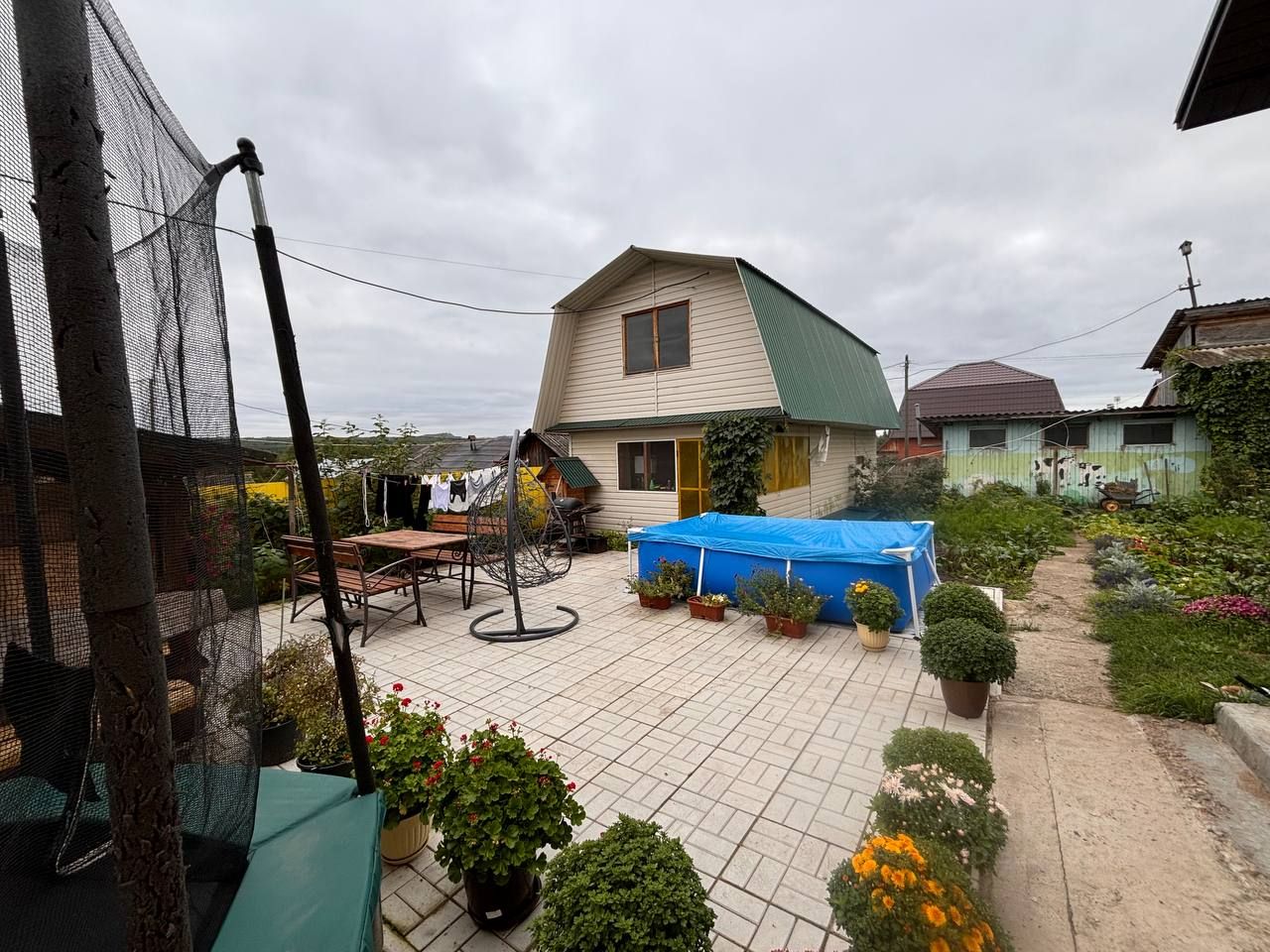 На земле ИЖС компактно размещены дом, гараж, баня, хоз. постройки и место для отдыха.