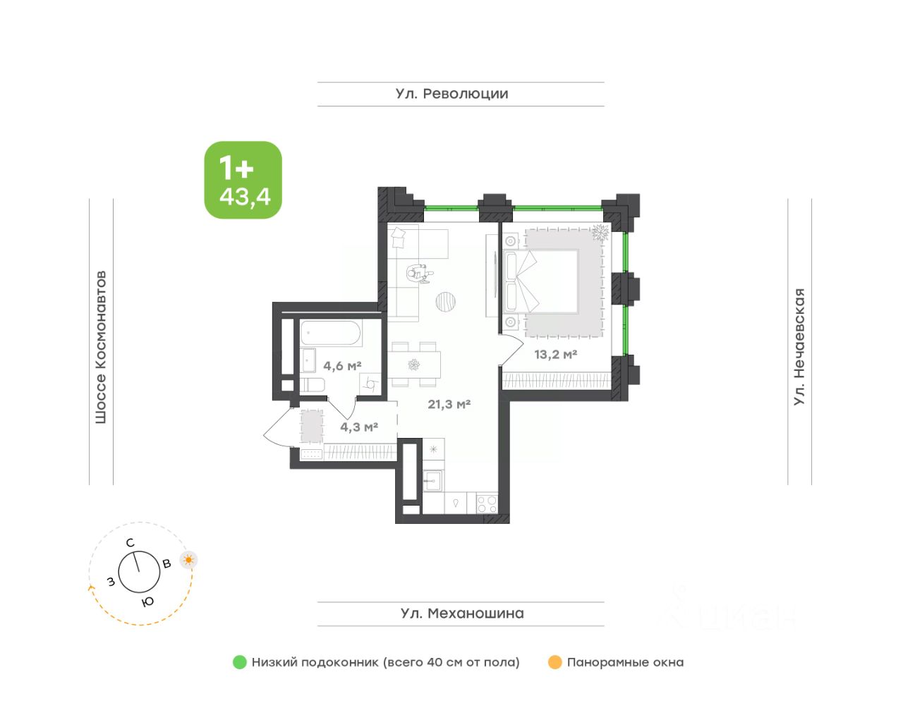 Большие окна с низким подоконником (всего 40 см от пола) наполняют интерьер светом и создают ощущение простора,
