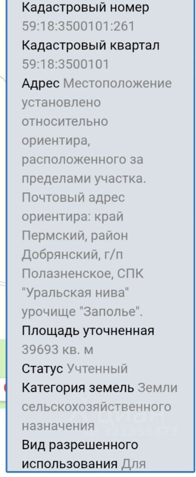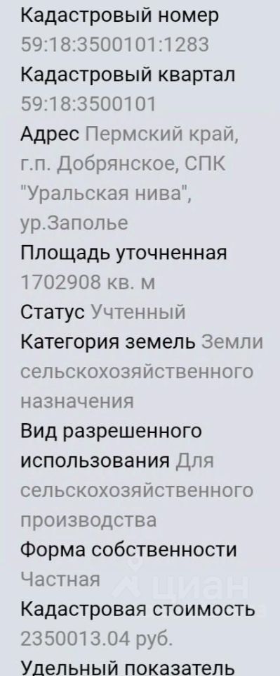 Продается земельный участок общей площадью 170 ГА (кадастровые номера 59:18:3500101:1283 и 59:18:3500101:261). Адрес: Пермский край, г.п. Добрянское, СПК ''Уральская нива'', ур.Заполье (примыкает к деревне Ключи). Категория земель Земли сельскохозяйственного назначения. Вид разрешенного использования Для сельскохозяйственного производства. Стоимость 30 000 000 рублей. По всем вопросам звоните.