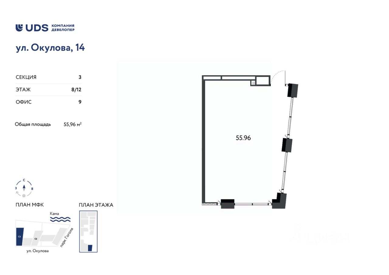 Помещение под офиc 55 м2 на 5 этажe МФК Окулова 14 от UDS.