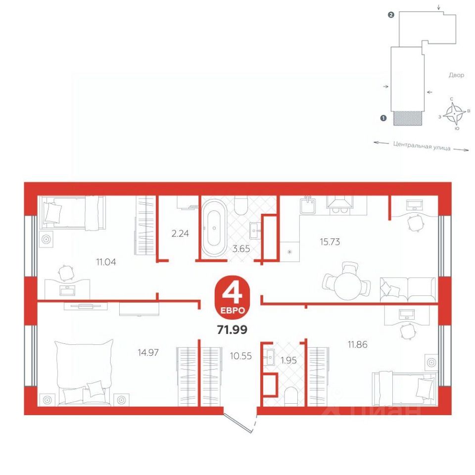 Площадь квартиры 71.99 м2 . Высота потолка 2,7 м.