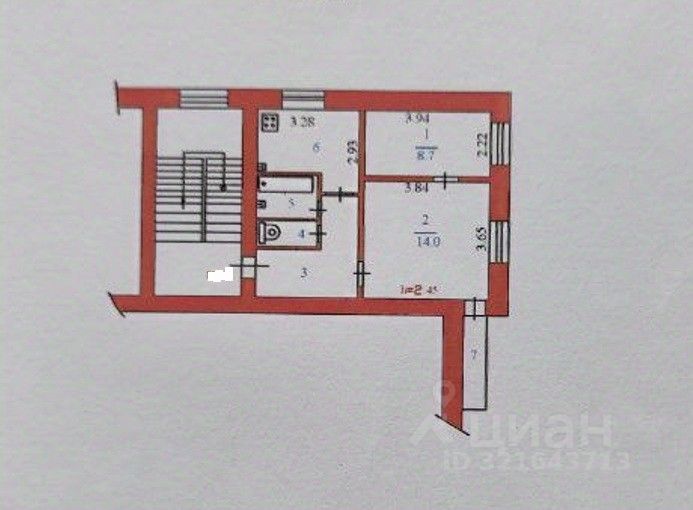 Общая площадь (без учета балкона) 41,2 м2. Жилая площадь 22,7 м2 (14 + 8,7 м2). Кухня 8,1 м2. Санузел 2,4 м2 + 1,1 м2. Коридор 6,9 м2. Балкон 2,3 м2.