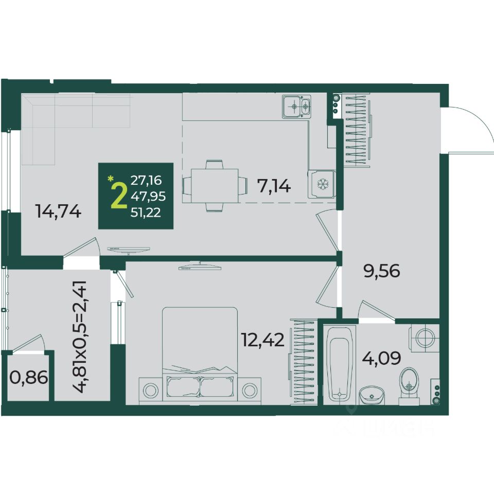 Общая площадь51,22 м2