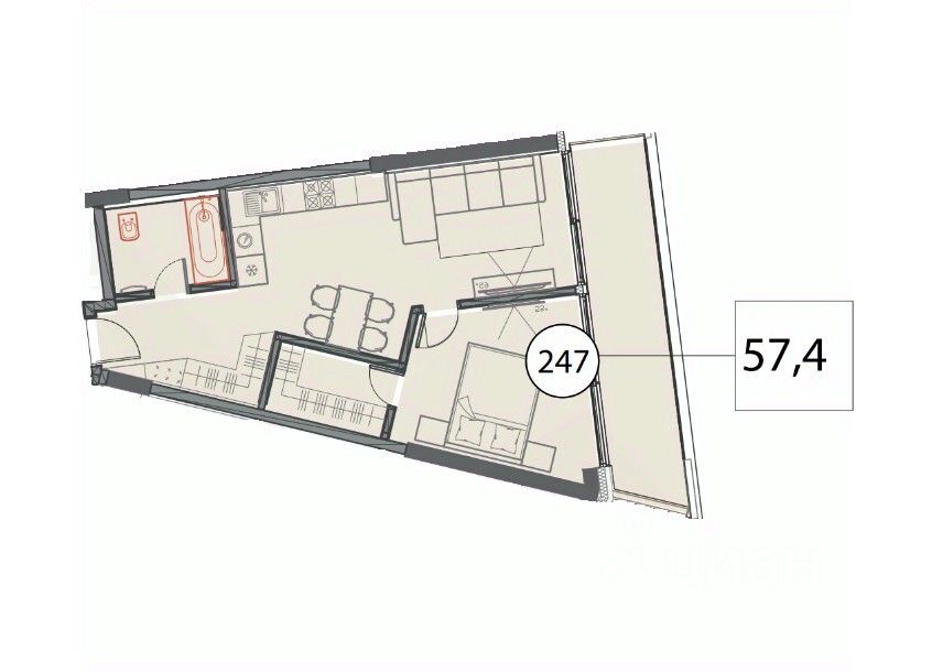 Общая площадь57,4 м2
