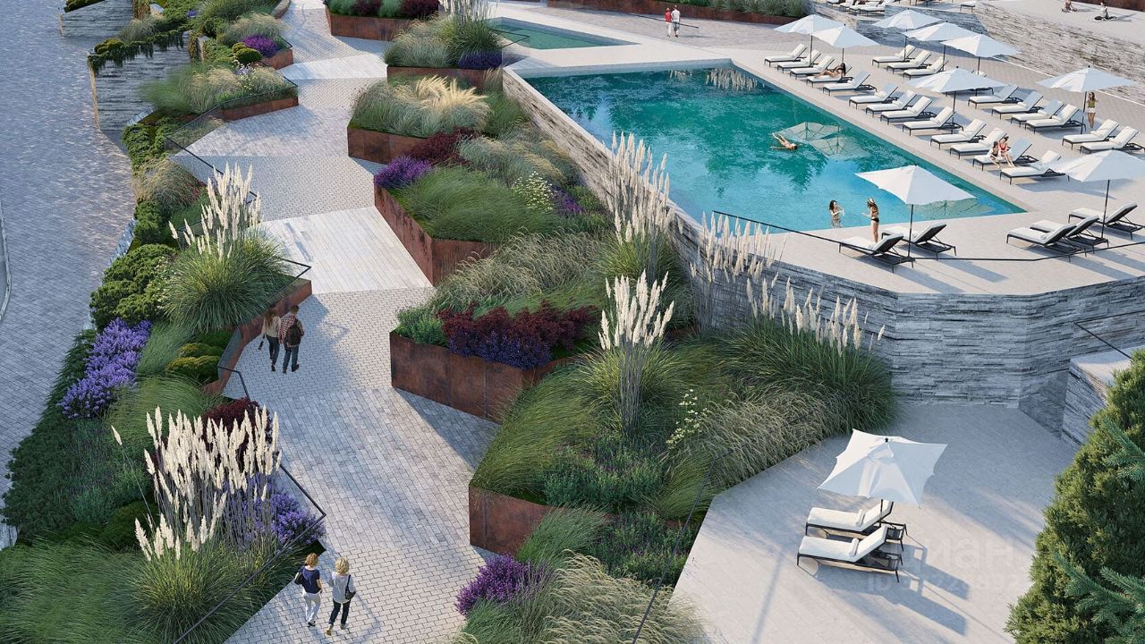 На территории комплекса ландшафтное озеленение, прогулочный теренкур , современная детская площадка, зона отдыха у бассейна.