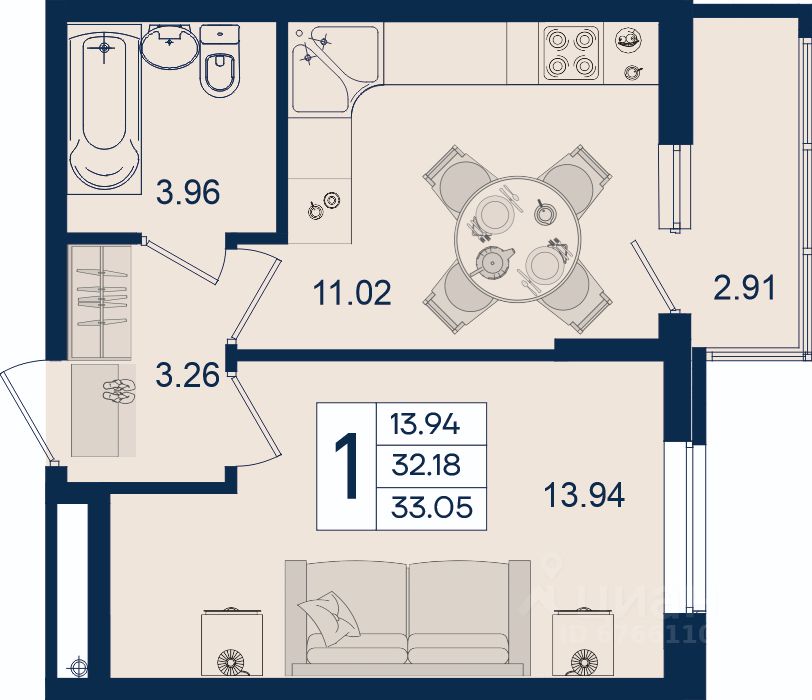 1 комнатная квартира 33.05 м² с ремонтом, на 2 этаже в жилом комплексе ''Дом 101''.