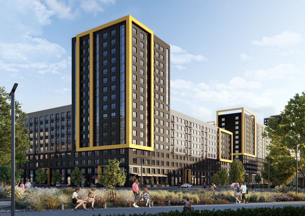Авторская концепция проекта эффектно выделяется в 3 особенностях комплекса: фасады, двор и места общего пользования.