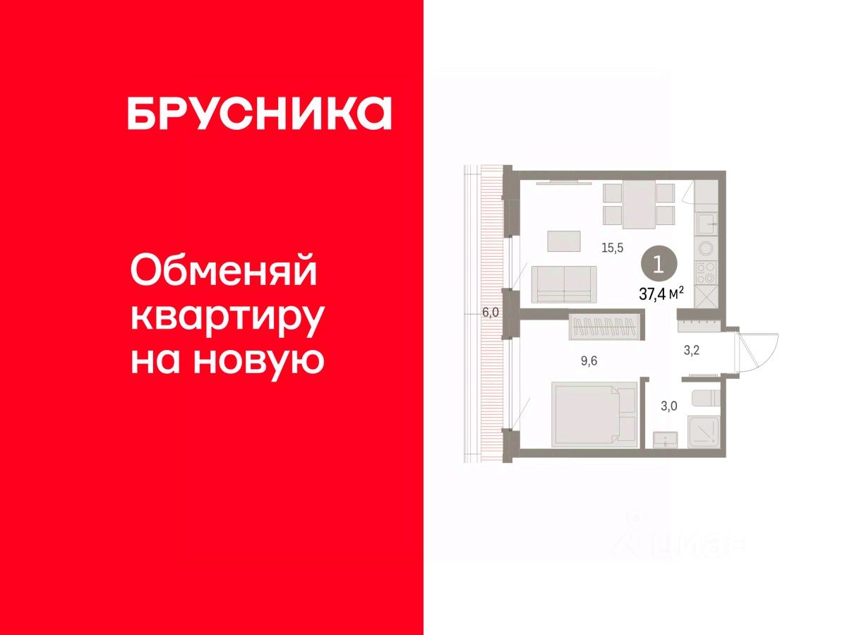 Квартира с кухней-гостиной и одной спальней в Бруснике в Академическом. Особенности планировки: предчистовая отделка, терраса на крыше. квартиры в нашей базе: АКД05-Ж8.8.5.