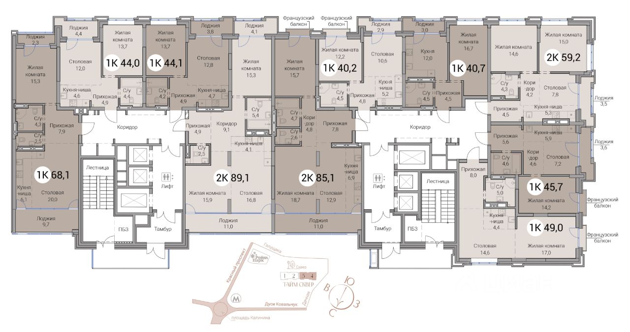 ЖК ''Тайм Сквер'' отличается многообразием планировочных решений: здесь можно выбрать резиденции площадью от 40 до 157 кв.м, в том числе резиденции с террасами, видовые резиденции и двухуровневые хайфлэты с высотой потолков 6 м. Инфраструктура Удобная локация в прямом доступе к центральной части города предоставляет жителям ''Тайм Сквер'' множество возможностей для комфортной жизни. Рядом находятся лучшие образовательные, культурные, медицинские и деловые заведения города, парки, множество детских спортивных и развивающих центров. В пешей доступности: • 5 минут до станций метро Заельцовская, Гагаринская • 5-7 минут до гимназии 9, частной школы ''Аврора'', школы 120, школы ''Журавушка'' • 2-5 минут до государственных и частных детских садов • 1 минута до ТРЦ Ройял Парк • 3 минуты до супермаркета ''Бахетле'' • 15 минут до зоопарка и дендропарка