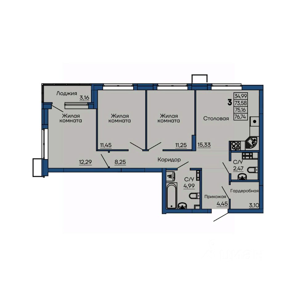 Трехкомнатная квартира с лоджией, гардеробной и двумя санузлами на 4 этаже. Окна выходят на ул. Гагарина и на ул. Библиотечная. Чистовая отделка под ключ. Дом в 15 минутах от центра города. Рядом остановки общественного транспорта, школы и детские сады.