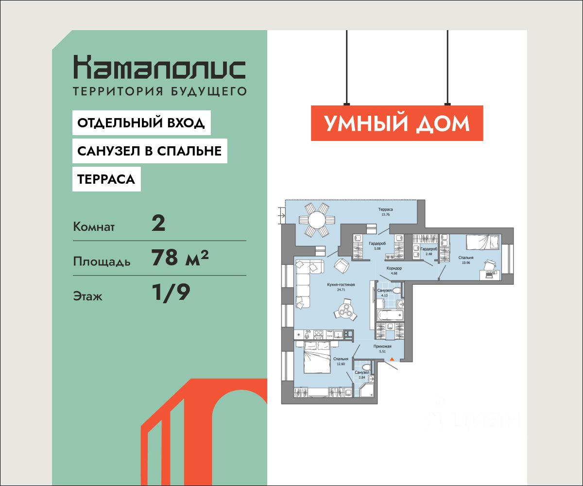 В новом жилом комплексе комфорт+ класса ''Камаполис'', расположенном на берегу реки Камы, продается 2-комнатная квартира площадью 78.00 кв. м. Квартира находится в 4 доме. Девелопер проекта - ''Железно''.